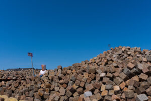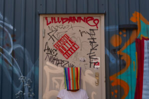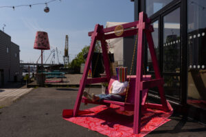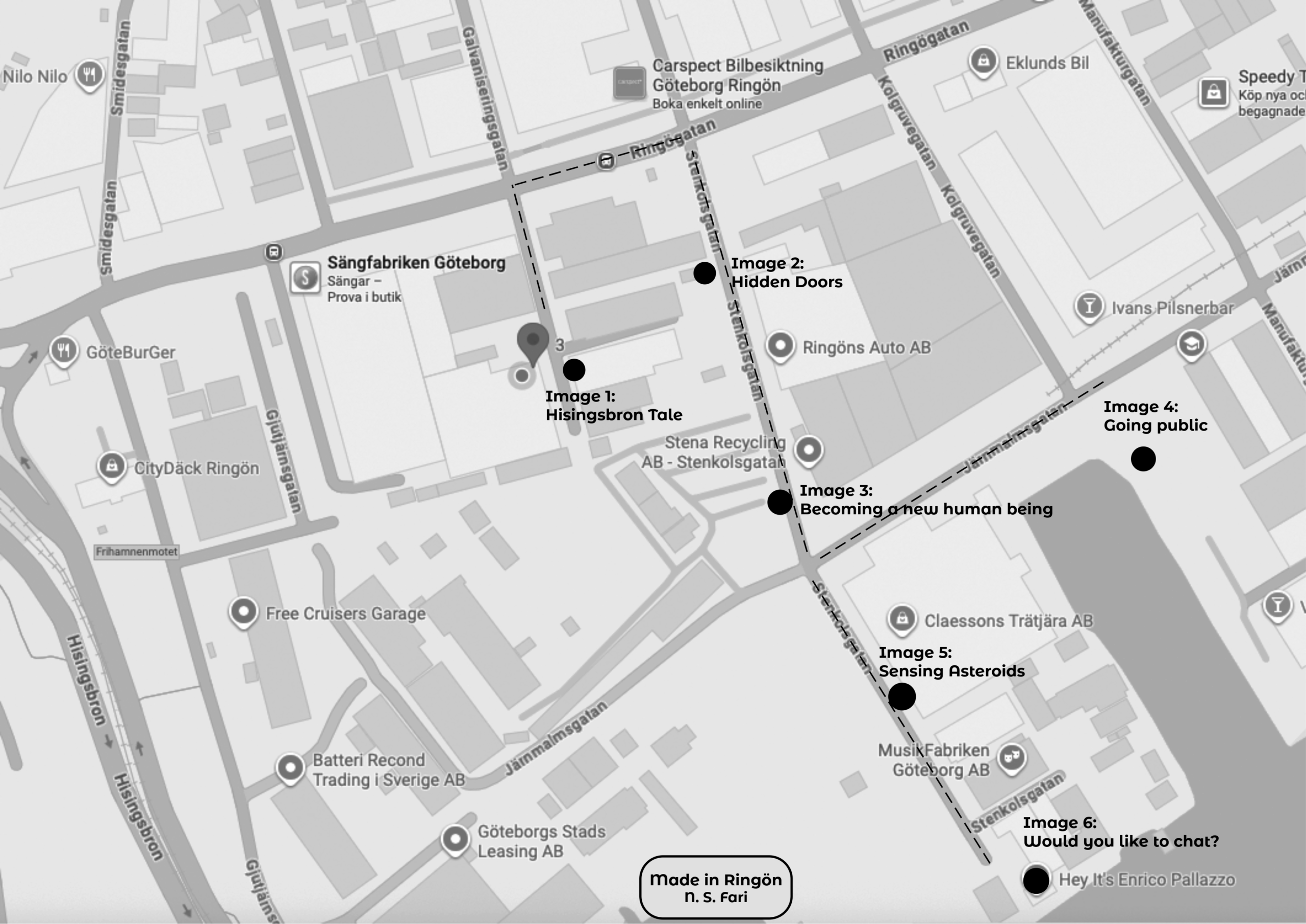 Welcome to the performative guided tour, Made in Ringön! This photographic series invites you to wander through the ever-changing landscape of Ringön, an island filled with workshops, small businesses, scrapyards and secrets. Installed close to where they were taken, each image offers a doorway into a narrative that blends fact and fiction, industry and myth. The figure with the coloured bag over its head is waiting there ready to be encountered again. Follow the images on the map and listen to the corresponding audio recordings. Let them guide you, confuse you and contradict you. At one location, you will be invited to complete a short documentation task. Consider it both evidence and invention: your own trace within Ringön. Take your time to experience Ringön from a dystopian yet humorous perspective, where doors don’t always lead where they promise and even the bridge may start whispering back.